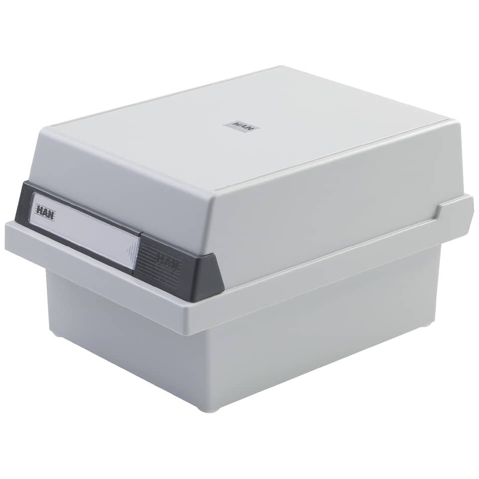 Karteikasten für ca. 800 Karten. Werkstoff: hochwertiger, schwermetallfreier Kunststoff. Das Unterteil kann platzsparend in den abnehmbaren Deckel gestellt werden, optimales Beschriftungsfeld, möbelschonende Kautschukfüßchen, inkl. 1 Stützplatte mit verschiebbarem Sichtreiter. Verwendung für Kartenformat: A5 quer. Größe (B x H x T): 235 x 190 x 250 mm. Farbe: lichtgrau.