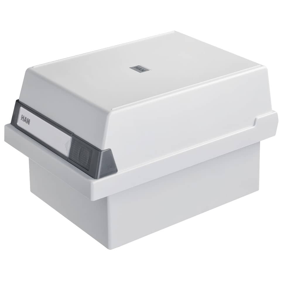 Karteikasten für ca. 800 Karten. Werkstoff: hochwertiger, schwermetallfreier Kunststoff.Das Unterteil kann platzsparend in den abnehmbaren Deckel gestellt werden, optimales Beschriftungsfeld, möbelschonende Kautschukfüßchen, inkl. 1 Stützplatte mit verschiebbarem Sichtreiter. Verwendung für Kartenformat: A7 quer. Größe (B x H x T): 133 x 121 x 250 mm. Farbe: lichtgrau.
