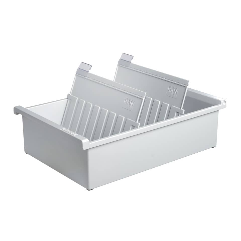 Karteitrog für ca. 1.300 Karten. Werkstoff: hochwertiger, schwermetallfreier Kunststoff. Möbelschonende Kautschukfüßchen und 2 Stützplatten sind inklusive. Je nach Schreibtisch passt der Trog auch in die Schreibtischschublade. Verwendung für Kartenformat: A5 quer. Größe (B x H x T): 228 x 96 x 347 mm. Farbe: lichtgrau.