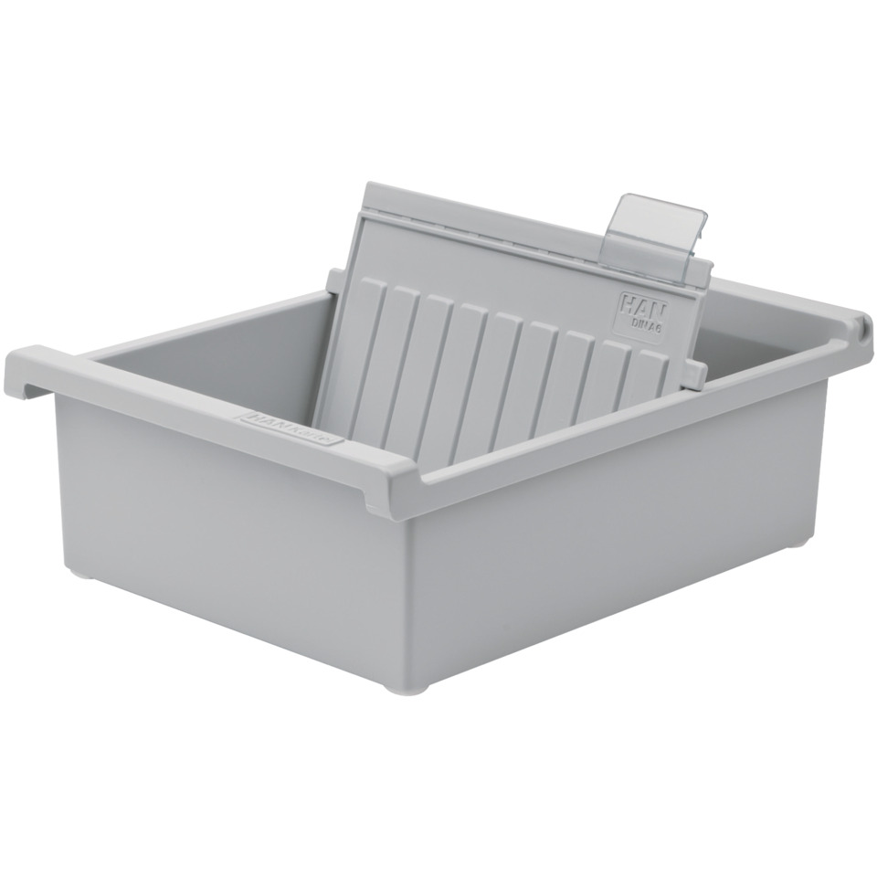 Karteitrog für ca. 800 Karten. Werkstoff: hochwertiger, schwermetallfreier Kunststoff. Möbelschonende Kautschukfüßchen und 1 Stützplatte mit verschiebbarem Sichtreiter sind inklusive. Je nach Schreibtisch passt der Trog auch in die Schreibtischschublade. Verwendung für Kartenformat: A6 quer. Größe (B x H x T): 171 x 76 x 235 mm. Farbe: lichtgrau.