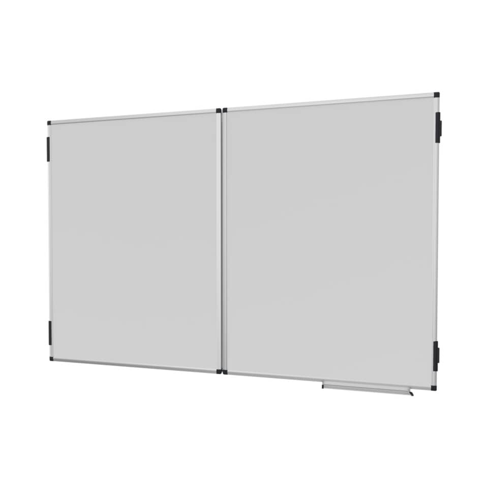 Magnetische Klapptafel mit viel Platz zum Schreiben sowie Anbringen von Notizen und Bildern – ideal für Konferenzräume oder Klassenzimmer. Zwei doppelseitige, ausklappbare Flügel, die mit Clips befestigt werden. Beschreibbar mit trocken abwischbaren Whiteboardmarkern. Magnetische Oberfläche aus emailliertem e3-Keramikstahl, Cradle to Cradle Certified™, Bronze-Level. Aluminiumrahmen mit grauen Kunststoff-Ecken (Pantone 433C). Lieferung mit Markerablage (30 cm), Montageset und Montageanleitung.