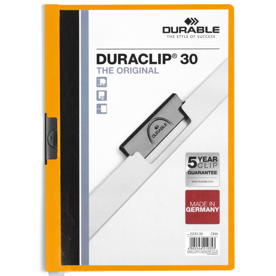 DURABLE Klemm-Mappe DURACLIP® 30, DIN A4, orange. Millionenfach im Gebrauch und weltweit die erfolgreichste Business-Mappe. DURACLIP® ist und bleibt das Original. Beim Präsentieren und Überzeugen, beim Ordnen und Archivieren. DURACLIP® ist dabei. Der Klassiker mit der Klemme aus flachem Spezialstahl, in verschiedenen Farben, Formaten und Ausführungen. DURACLIP® passt sich an. Fassungsvermögen: 130 Blatt DIN A4