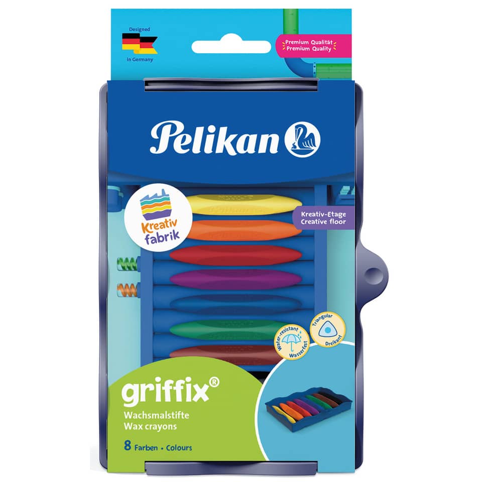 Die Pelikan Wachsmaler griffix® in langlebiger und wiederverwendbarer Kreativfabrik-Etage sind wasserfest haben eine ergonomische Dreikantform mit langer Griffzone in 8 leuchtende Farben: gelb, orange, rot, violett, blau, grün, braun, schwarz. Sie sind die Stufe 1 des griffix® Schreiblernsystems. Geeignet für Links- und Rechtshänder. Inclusive Stickerbogen zur Individualisierung und Namensbeschriftung der Box. Nachfüllbar. Als Ergänzung zum Malzubehörset klein oder groß. Stapelbar und kombinierbar mit weiteren Kreativ-Etagen aus dem Sortiment der KreativFabrik. Mit Banderole mit Euroloch. Ausführung der Schaftform: dreikant. Werkstoff: synthetischer Wachs. Größe (Ø x L): 90 mm. Schreibfarbe von Schreibgeräten: Stiftfarbe.