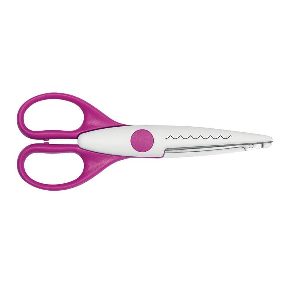 Kreativschnittschere Ziegel · Scherenlänge: 160 mm · Schnittart: Ziegelschnitt · Schere eigenet sich ausgezeichnet zum Gestalten von Karten, Verschönern von Bildern oder zum Basteln · große Griffe daher auch für Erwachsene gut geeignet · Farbe: magenta · im praktischen Etui verpackt