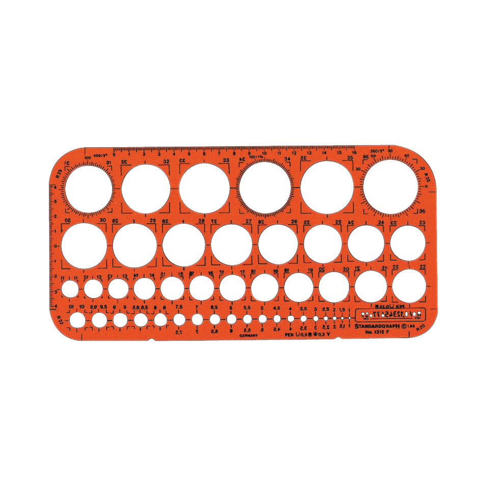 Kreisschablone Ø 1-36 mm (45 Kreise), 4 Eckenradien 20-32 mm, Einweisungsmarkierungen, Feinabstufung 0,5 (1-10), Zahlen 3,5 mm, Oberfläche blendfrei. Mit Fingerlift und Tuschefacett.