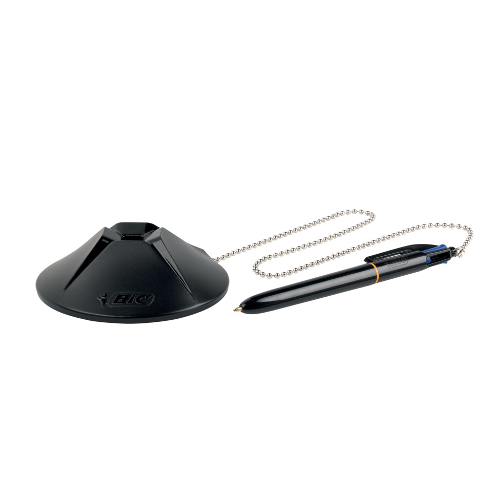 Kugelschreiber-Ständer mit Druckkugelschreiber BIC® 4 Colours® Counter Pen. Werkstoff: Kunststoff. Anzahl der Stifthalterungen: 1. Ausführung: Kugelschreiber an stabiler Kette befestigt, Länge der Kette: 580 mm. Inklusive 4 blauer Minen, Strichstärke: 0,32 mm, nachfüllbar, Dokumentenechte Tinte (ISO 12757-2, blau), Schreiblänge: durchschnittlich 8 km*, Gesamtgewicht: 229 g, Ständer versehen mit doppelseitigem Klebepad und 4 Anti-Rutsch_Noppen. Größe (Ø x H): 100,5 x 32 mm. Farbe: schwarz.
