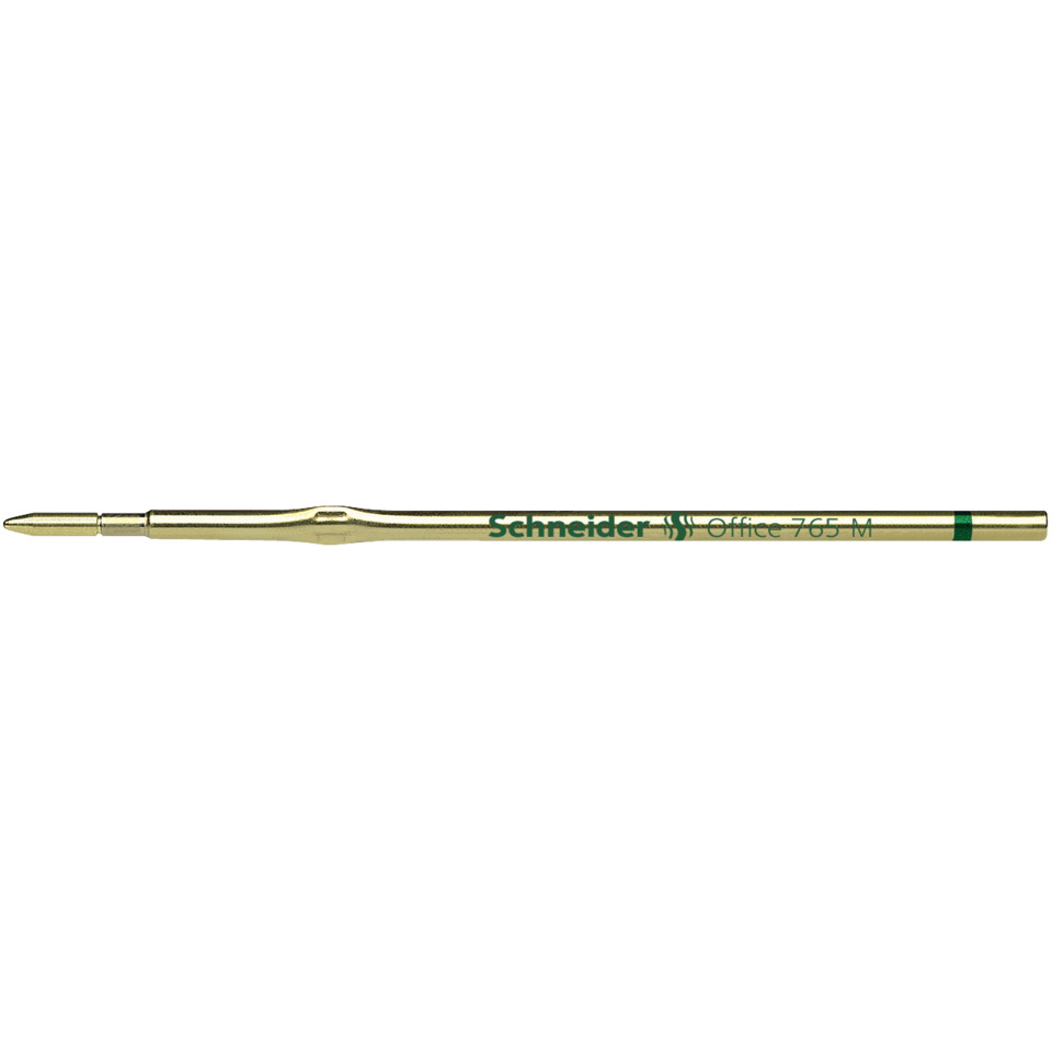 Kugelschreibermine Office 765. Verwendung für Produkt: Ersatzmine für Schneider Kugelschreiber K15, Office und Fave. Typbezeichnung der Mine: Metallmine im Format X20 mit Jumbospitze. Ausführung Mine: M, grün, dokumentenecht. Typbezeichnung der Mine gemäß ISO-Norm: ISO 12757-2. Material des Schaftes: Metall. Länge: 107 mm.