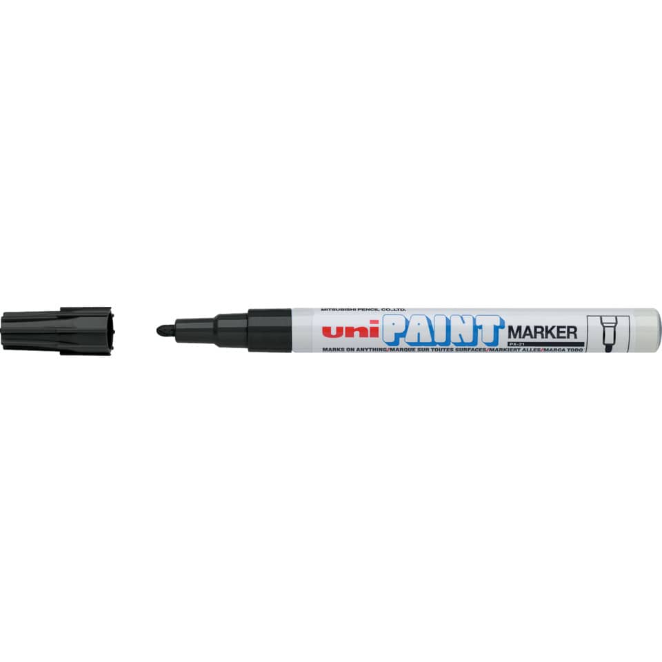Lackmalstift uni-ball® PX-21 schwarz. Lackmalstift uni-paint PX21 für wasserfestes Markieren, Schreiben und Malen. Für fast alle glatten Oberflächen, selbst Glas und Porzellan. Lichtecht und durch Laugen bzw. Spiritus lösbar. Art der Schreibflüssigkeit: Lack, wasserfest, – °C, lichtbeständig gegeben, wischfest. Ausführung Spitze: Rundspitze. Folienversiegelung, Acrylspitze. Material des Schaftes: Alu. Farbe des Schaftes: Weiß. Strichstärke: 1-1,5. Schreibfarbe von Schreibgeräten: schwarz.