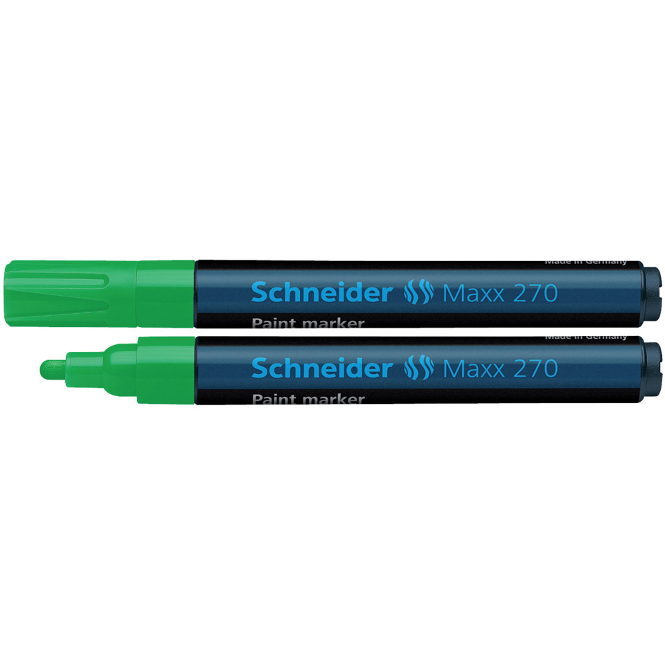 Lackmarker Maxx 270. Art der Schreibflüssigkeit: Tinte auf Alkoholbasis ohne Toluol und Xylol, wasserfest, 300 °C, lichtbeständig gegeben. Ausführung Spitze: Rundspitze, Spitze austauschbar. Für raue und glatte Oberflächen, z.B. Papier, Kunststoff, Glas, Metall, Keramik, etc. Sehr gute Haftung und Abriebbeständigkeit auf fast allen Materialien. Beständig gegen viele Ätzmittel und Waschvorgänge. Ventilgesteuerter Tintenfluss. Material des Schaftes: Kunststoff. Kappe umsteckbar. Farbe des Schaftes: tiefblau-grün. Strichstärke: 1-3 mm. Schreibfarbe von Schreibgeräten: grün.