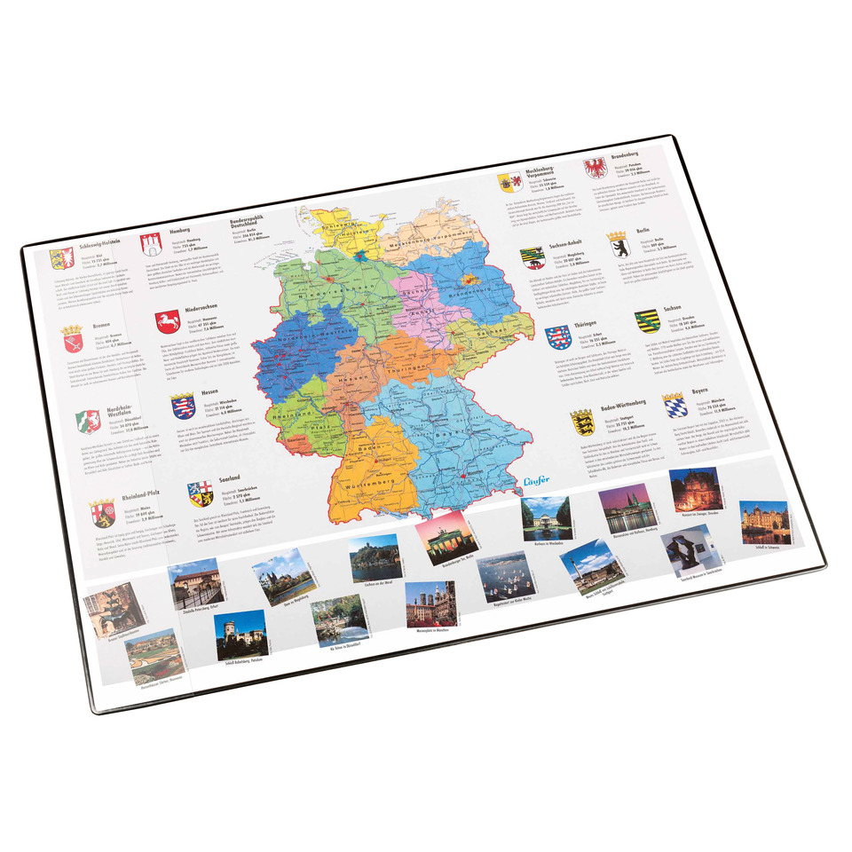 Abwaschbare Schreibunterlage aus recycelbarem Kunststoff mit rutschfester Rückseite. Top-Qualität durch 3-Schichten-Aufbau. Karte unter Folie eingeschweißt.