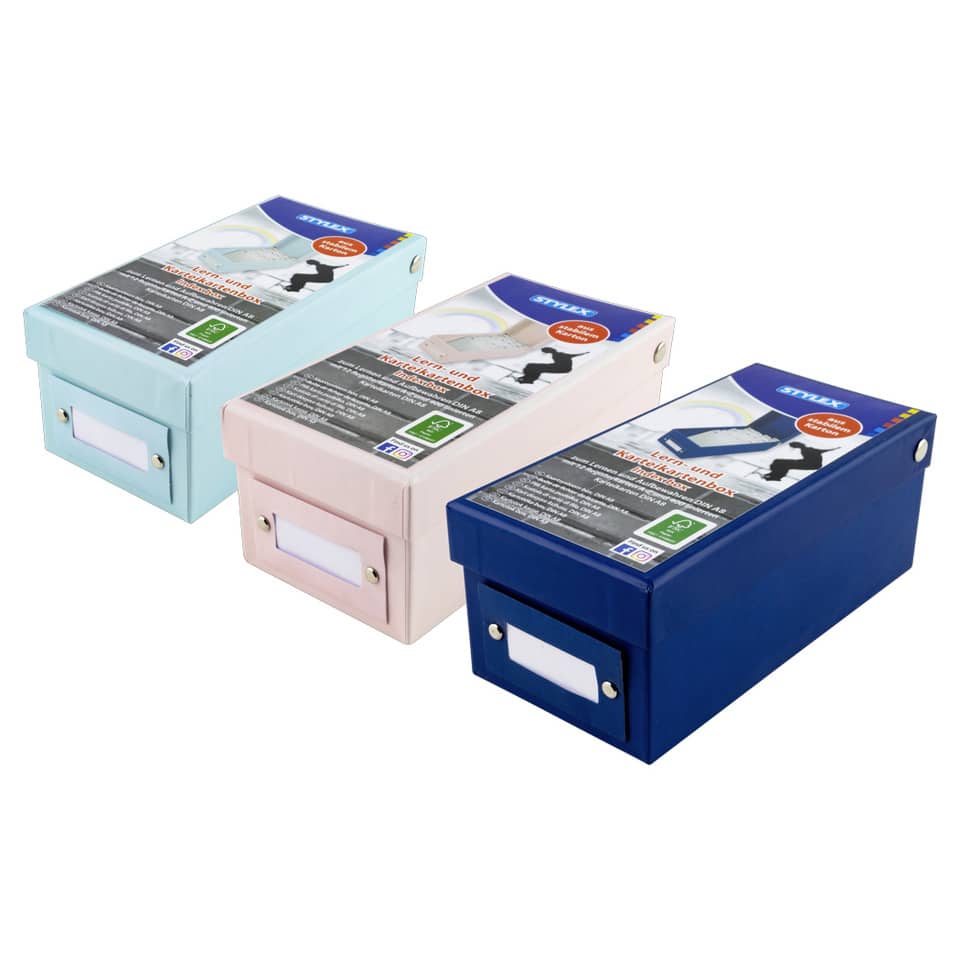 Lern- und Karteikartenbox, DIN A8, aus hochwertigem Karton, mit 12 Registerkarten A-Z und 400 linierten Karteikarten DIN A8, in hellblau, rosa und dunkelblau erhältlich.