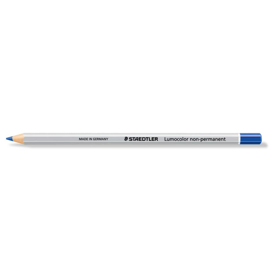 Lumocolor® non-permanent omnichrom Trockenmarker. Produktverwendung: für fast alle Flächen. Ausführung Stift: Holz, Schaft lackiert. Wasserlöslich, aus vielen Textilien auswaschbar, geruchlos, farbintensiv und lichtecht. Länge: 175 mm. Farbe des Schaftes: silber, Tauchkappe in Minenfarbe. Strichstärke: richtet sich nach Abschriebwinkel. Schreibfarbe von Schreibgeräten: blau.