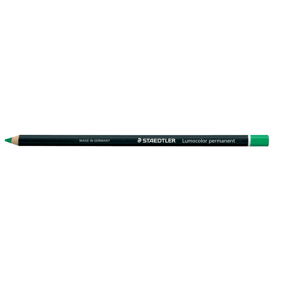 Lumocolor® permanent glasochrom Trockenmarker. Produktverwendung: für fast alle Flächen. Ausführung Stift: Holz, Schaft lackiert. Wasserfest, farbintensiv und lichtecht, schlägt nicht durchs Papier, deckende Markierungen auch auf dunklen und transparenten Flächen, geruchlos. Länge: 175 mm. Farbe des Schaftes: schwarz, Tauchkappe in Minenfarbe. Strichstärke: richtet sich nach Abschriebwinkel. Schreibfarbe von Schreibgeräten: grün.