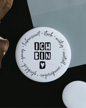 Magnet mit Spruch: „Ich bin stark mutig wertvoll wunderschön glücklich genug liebenswert“ Maße: 56 mm Durchmesser Matt und samtweich Design: Spruch oder Illustration in Schwarz-Weiß Perfekt für den Kühlschrank oder die Pinnwand Magnet Ich bin stark mutig wertvoll