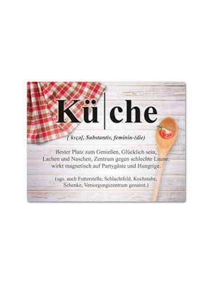 Magnet mit Spruch: Maße: 8 x 10,6 cm Kü/che Substantiv, feminin-(die) Bester Platz zum Genießen, Glücklich sein, Lachen und Naschen, Zentrum gegen schlechte Laune, wirkt magnetisch auf Partygäste und Hungrige. (ugs. auch Futterstelle, Schlachtfeld, Kochstube, Schenke, Versorgungszentrum genannt.) Magnet Küche
