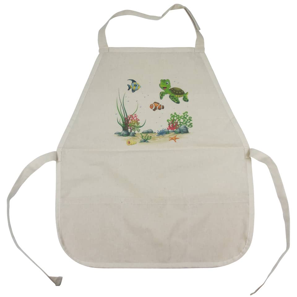Kinder Mal-/Bastelschürze, mit Motivdruck Meerestiere, große Vordertasche mit 3 Einsteckfächern für Mal- und Bastelutensilien, mit Klettverschluss im Nacken und Bändern am Rücken zu schließen, inkl. Namensetikett, Material Baumwolle, Universalgröße 54x46cm.