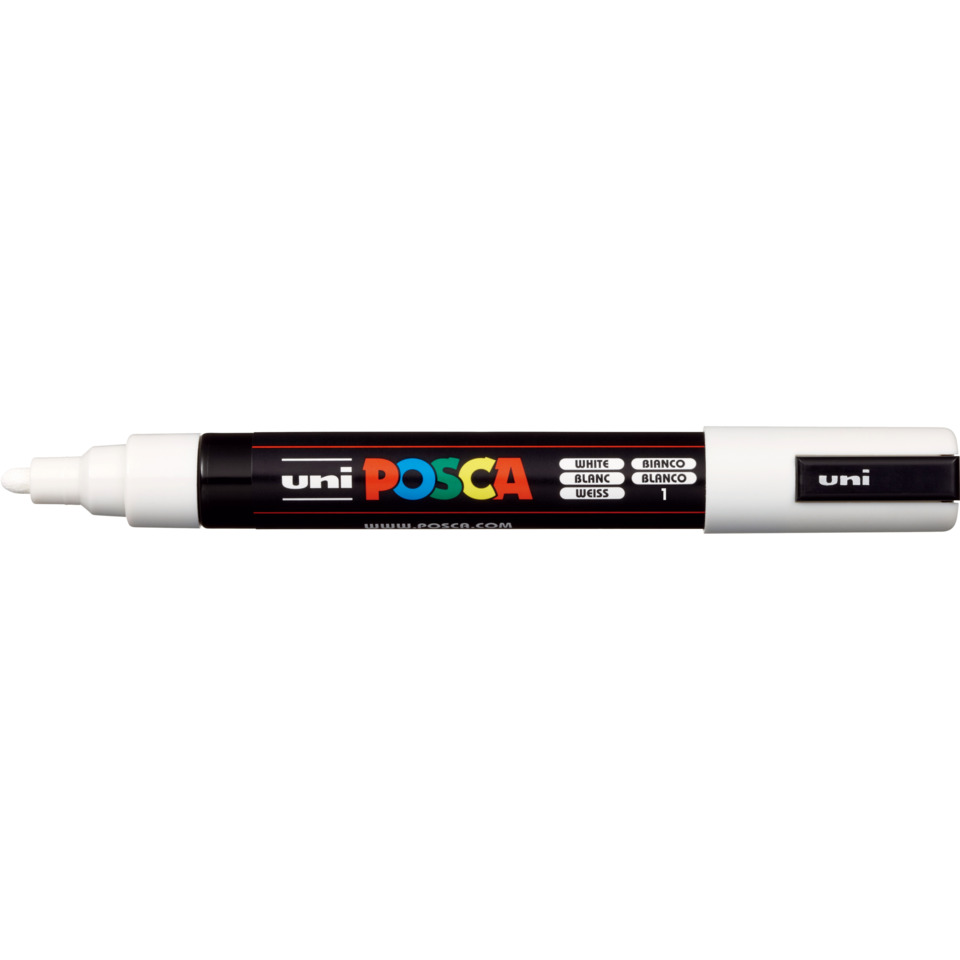 Marker UNI POSCA PC-5M. Bezeichnung der Schreibflüssigkeit: Pigmenttinte. Ausführung der Spitze: Rundspitze. Spitze austauschbar. Tinte auf Wasserbasis, lichtecht, umdrehbare Spitze. Material des Schaftes: Kunststoff. Ausführung der Griffzone: rund. Farbe des Schaftes: schwarz. Strichstärke: 1,8-2,5 mm. Schreibfarbe von Schreibgeräten: weiß. Die Farben können zusammen gemischt werden, solange die Farbe noch feucht ist. Mit einem Wassertropfen erhält man einen Aquarelleffkt.