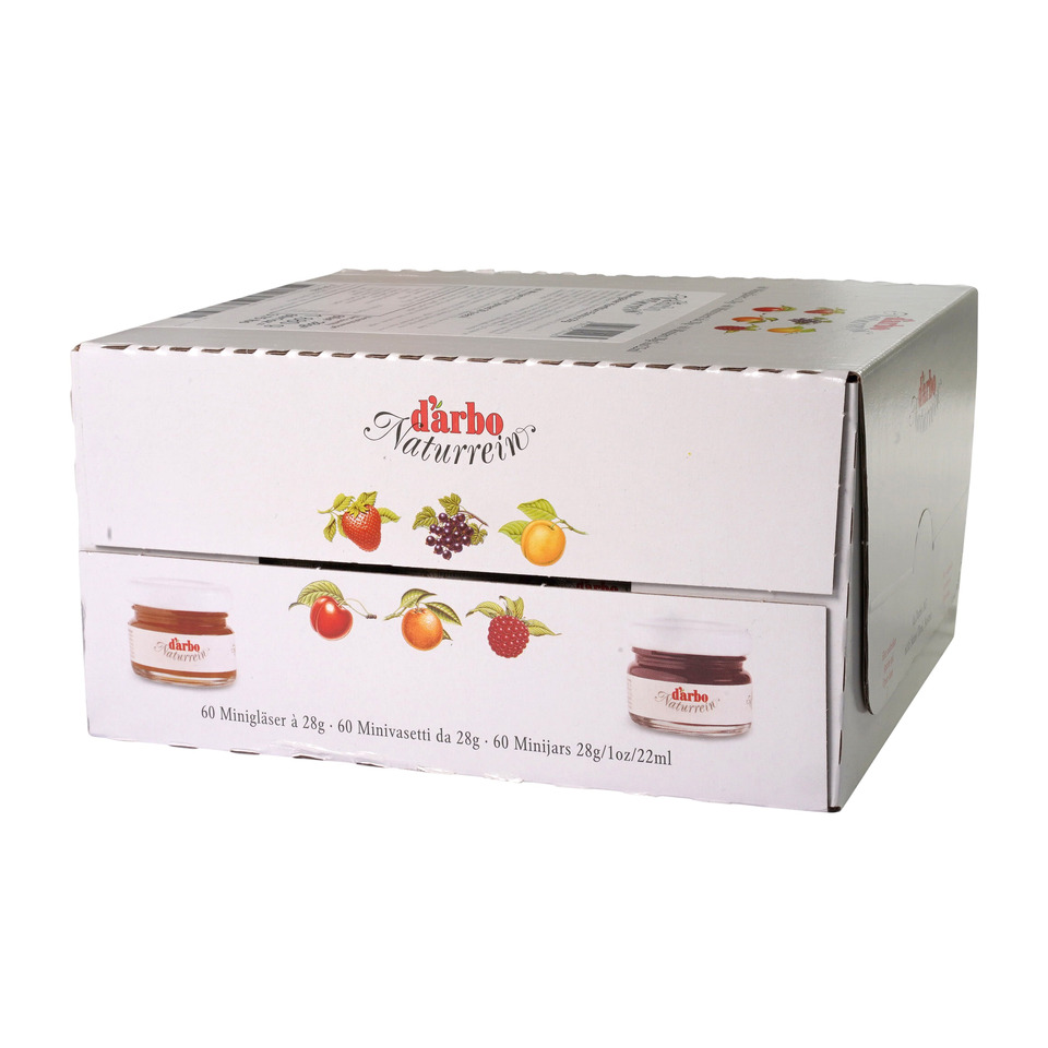 Eine vielfältige Auswahl an fruchtigen Konfitüren in einzeln abgefüllten Portionsgläsern: Das Darbo Sortiment im Miniglas beinhaltet die fünf Sorten Erdbeere, Marille (Aprikose), Himbeere, Kirsche und schwarze Johannisbeere. Die Portionsgläser eignen sich ideal für Cafés, Hotels oder Bäckereien. Entscheiden Sie sich für das Darbo Sortiment mit zwölf Mini-Konfitürengläser pro Geschmackrichtung in praktischer Portion. Die Konfitüre ist halal, koscher und vegan.