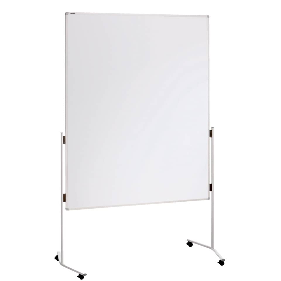 Moderationstafel ECO. Ausführung des Fußes: leicht gebogener Standfuß. Lenkrollen feststellbar. Beidseitig verwendbar, schnelle Montage. Gesamthöhe: 1950 mm. Tafelgröße (B x H): 120 x 150 cm. Masse (Gewicht): 5.1 kg. Farbe/Material der Vorderseite: weiß/kartonkaschiert. Farbe/Material der Rückseite: weiß/kartonkaschiert. Material des Rahmens: Aluminium, weiß. Verpackung: Karton.