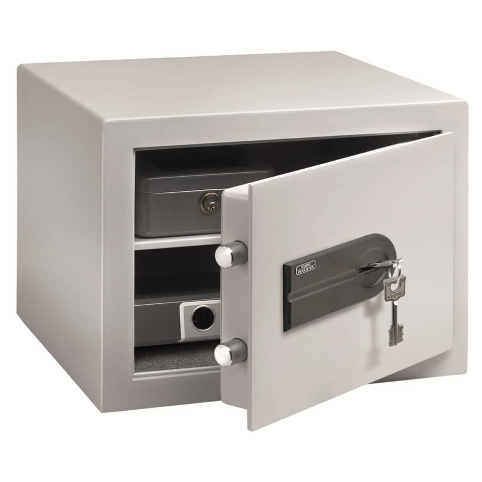Doppelwandiger Einsatzschrank der Sicherheitsstufe B nach VDMA 24992, Stand Mai 1995. Feuerschutzmaterial nach DIN 4102-A1. Verriegelung durch Rundbolzen. Umlaufender Feuerfalz. Verankerungsmöglichkeit in der Rückwand und im Boden. Innenraum in Ordnertiefe. Farbe: grau. CityLine S: Mit Sicherheitsdoppelbartschloss VdS-geprüft, ECB.-S-zertifiziert EN 1300 Klasse A.
