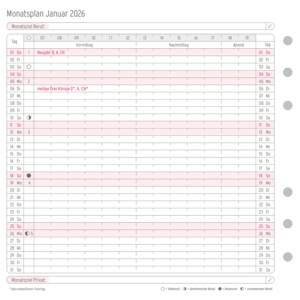 Monatsplan. Format: Midi. Abmessungen: 96 x 172 mm. Material: Papier. Farbe: Weiß. Grammatur: 120 g/m². Jahr: 2026. Art der Lochung: Universallochung. Ausstattung mit: zum Ausklappen, mit Aktivitätenliste für den jeweiligen Monat. Nachhaltigkeit Produkt: chlorfrei gebleicht. Inhalt: 12 Blätter / 1 Stück