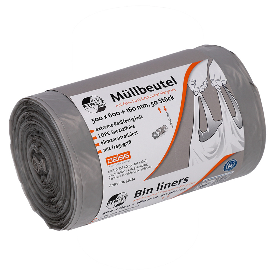 FIRST PLUS pcr Müllbeutel mit Tragegriff aus LDPE mit 80% PCR, 30 l mit Umweltzeichen Blauer Engel- 50 Stück/Rolle, 1.000 Stück/Karton. Der FIRST PLUS PCR Müllbeutel ist in jeder Hinsicht die erste Wahl für Müllentsorgung. Dank optimierter Herstellung wurde ihr CO2-Fußabdruck reduziert. Die verbleibenden Restemissionen werden über Klimaschutzprojekte mit Gold Standard kompensiert. Die hochwertige Spezialfolie wurde mit 80 % Post-Consumer-Rezyklat erweitert, damit auch die Kreislaufwirtschaft gestärkt wird. Und dank schnell zu öffnender Banderole und patentiertem Easy Opener ist der robuste Beutel auch deutlich effizienter in der Anwendung. Ein entscheidender Vorteil, wenn¿s mal wieder schnell gehen muss.