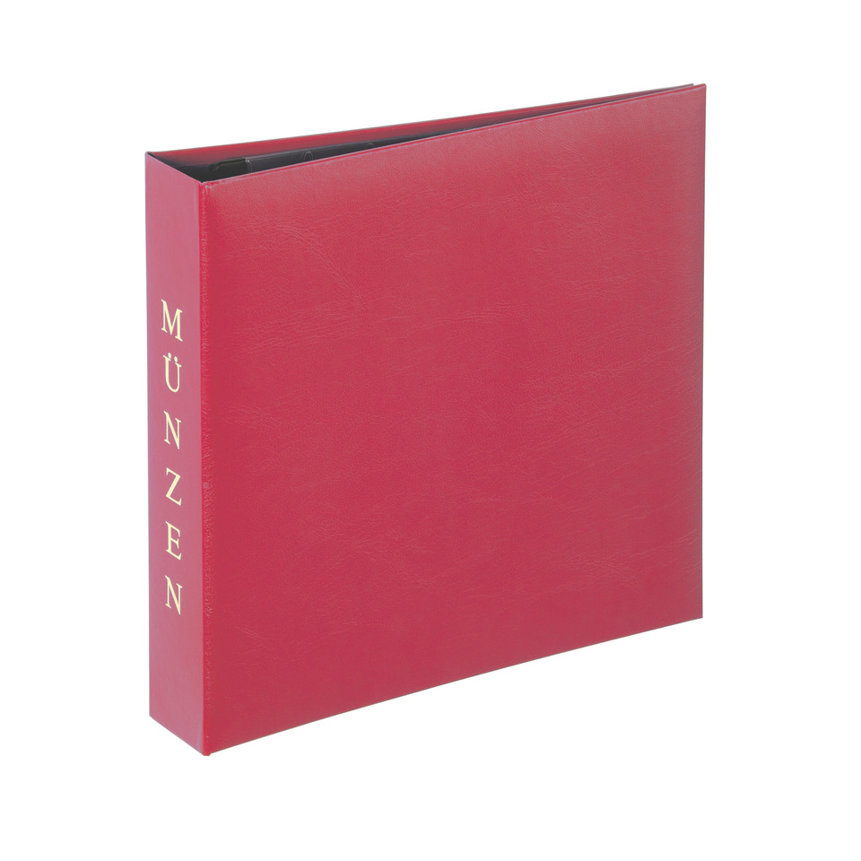 PAGNA Münzalbum, 4-Ring-Mechanik, weinrot – für den Markt: D / L / A / CH. Hochwertiger Kunststoffeinband mit Goldprägung „MÜNZEN“, in buchbinderischer Verarbeitung, 2 Münzhüllen und 2 schwarze Kartontrennblätter. Maße: (B)245 x (T)50 x (H)250 mm. Münzhüllen jeweils 6 Reihen, sortiert in 3 Größen: (B)25 x (H)20mm + (B)35 x (H)30mm + (B)45 x (H)40mm.