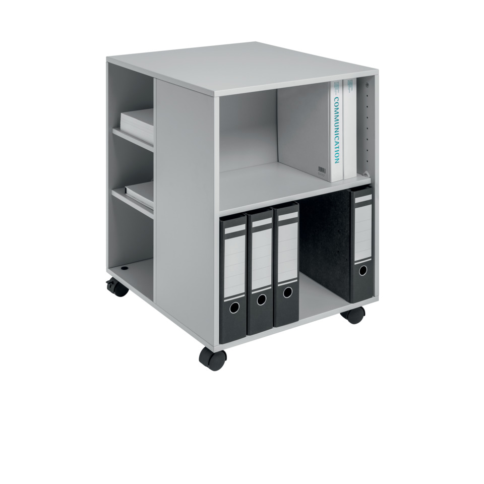 Multifunktionswagen 74/59 offen, grau. Multifunktions-Fahrwagen 3-seitig offen mit 6 Böden und einer Ablageplatte für die Unterbringung von Ordnern etc. Belastbarkeit des oberen Bodens ca. 25 kg. Hochwertig aus 16 mm starkem, melaminbeschichtetem Holz, das Schutz gegen Kratzer bietet. Voll mobil mit 4 Rollen, 2 davon mit Bremse. Maße (HxBxT): 737 x 528 x 592 mm. Lieferung erfolgt demontiert mit Montageanleitung.