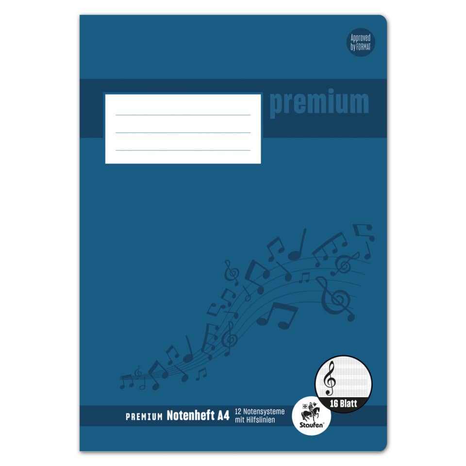 Notenheft PREMIUM Academy. Ausführung Papier: chlorfrei gebleichter Zellstoff, 90 g/qm. Ausstattung: klammerngeheftet. Hochwertiger, stabiler Umschlag, lackiert. Papierformat: A4 hoch. Lineatur: 12 Notensysteme mit Hilfslinien „Musikus“. Anzahl der Blätter: 8 Blatt. Farbe des Einbandes: farbig mit weißem Beschriftungsfeld. (Alte Artikelnummer: 17515).
