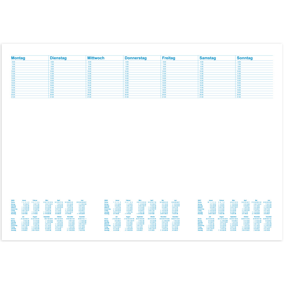 Auf der Notiz Schreibunterlage aus Papier mit Kartonunterlage ist viel Platz für Notizen aller Art. Es stehen 7 Wochentagsfelder und ein großes allgemeines Notizfeld zur Verfügung. Mit Stundeneinteilung pro Wochentag und einem 3 Jahreskalendarium.
