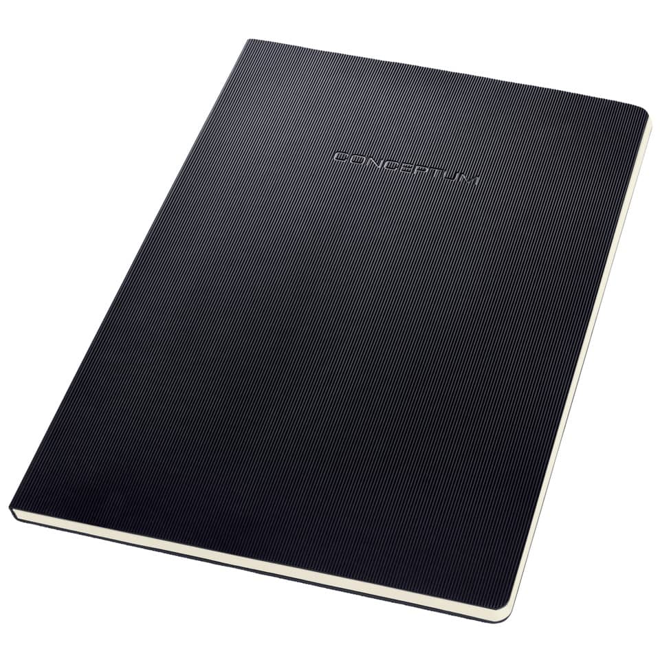 Schwarzer, linierter Notizblock Conceptum. Einband mit geriffelter Kunststoff-Oberfläche. Deckel aus Softcover, Rücken stabiles Hardcover. Flexibler Buchrücken zum einfachen Umschlagen des Covers (Bindung nicht mit dem Buchrücken verbunden). Enthält 120 Seiten, Papier cremefarben. Seitenformat exakt DIN A4 (210×297 mm). Alle Blätter mit 4-fach Lochung sowie heraustrennbar dank Klebebindung. Quickpocket im hinteren Einband. Die Größe des Blocks ist ähnlich DIN A4.