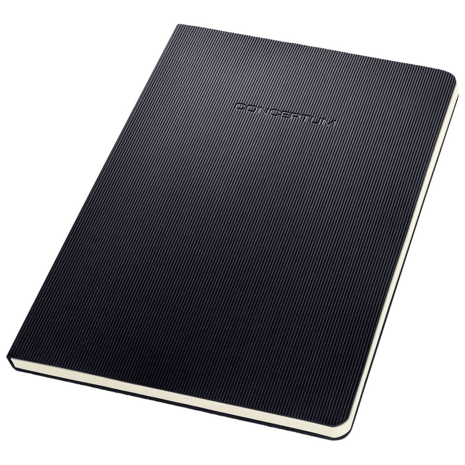 Schwarzer, karierter Notizblock Conceptum. Einband mit geriffelter Kunststoff-Oberfläche. Deckel aus Softcover, Rücken stabiles Hardcover. Flexibler Buchrücken zum einfachen Umschlagen des Covers (Bindung nicht mit dem Buchrücken verbunden). Enthält 120 Seiten, Papier cremefarben. Seitenformat exakt DIN A5 (148×210 mm). Alle Blätter mit 2-fach Lochung sowie heraustrennbar dank Klebebindung. Quickpocket im hinteren Einband. Die Größe des Blocks ist ähnlich DIN A5.