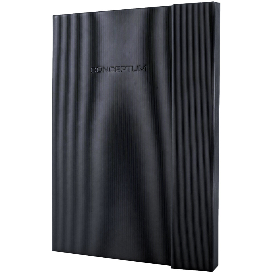 Schwarzes,kariertes Notizbuch Conceptum. Hardcover-Einband mit geriffelter Kunststoff-Oberfläche. Enthält 194 nummerierte Seiten, inklusive 20 perforierter Blätter zum Heraustrennen. Zu den Besonderheiten zählen Stiftschlaufe, Magnetverschluss, Inhaltsverzeichnis, Quickpocket, Archivtasche mit 2 Kartenfächern für je bis zu 10 Visitenkarten und 2 Zeichenbänder. Die Größe des Buches ist ähnlich DIN A4. Maße: 207 x 280 x 22,5 mm.