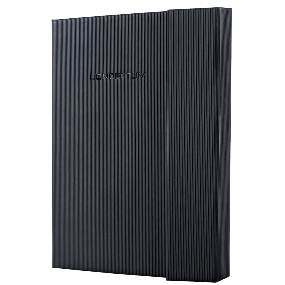 Schwarzes, kariertes Notizbuch Conceptum. Hardcover-Einband mit geriffelter Kunststoff-Oberfläche. Enthält 194 nummerierte Seiten, inklusive 20 perforierter Blätter zum Heraustrennen. Zu den Besonderheiten zählen Stiftschlaufe, Magnetverschluss, Inhaltsverzeichnis, Quickpocket, Archivtasche mit Kartenfach für bis zu 10 Visitenkarten und 2 Zeichenbänder. Die Größe des Buches ist ähnlich DIN A5. Maße: 155 x 203 x 22,5 mm.