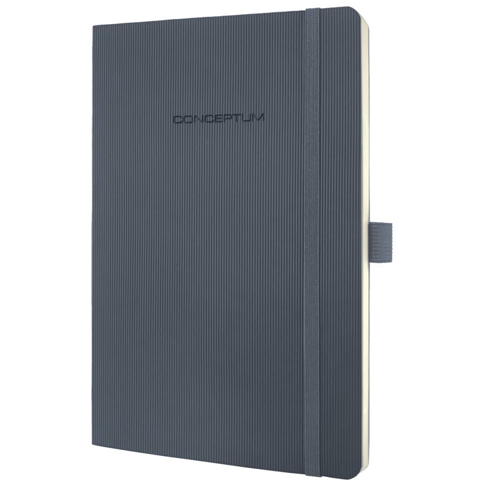Flexibles Softcover mit gerillter Softwave-Oberfläche und Gummizug. In modernen Businessfarben mit allen praktischen Conceptum Funktionen. Black grey, liniert, nummierte Seiten, Inhaltsverzeichnis, Gummibandverschluss, Stifteschlaufe, 194 Seiten, Papier 80 Gramm, 135x210x14mm.
