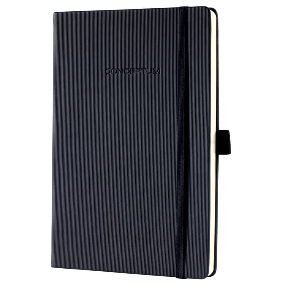 Schwarzes, punktkariertes Notizbuch Conceptum. Hardcover-Einband mit geriffelter Kunststoff-Oberfläche. Enthält 194 nummerierte Seiten, inklusive 20 perforierter Blätter zum Heraustrennen. Zu den Besonderheiten zählen Stiftschlaufe, Gummibandverschluss, Inhaltsverzeichnis, Quickpocket, Archivtasche mit Kartenfach für bis zu 10 Visitenkarten, 2 Zeichenbänder und Titel- und Rückenetiketten. Die Größe des Buches ist ähnlich DIN A5.