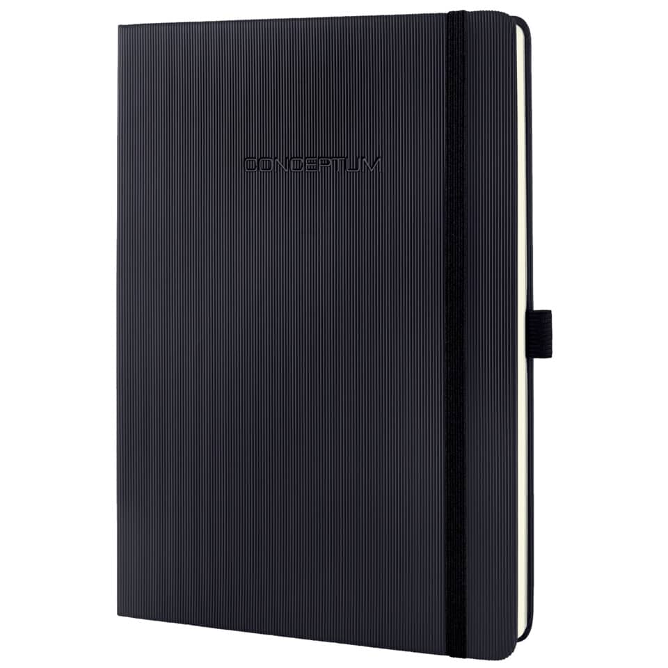 Schwarzes, kariertes Notizbuch CONCEPTUM. Hardcover-Einband mit geriffelter Kunststoff-Oberfläche. Enthält 194 nummerierte Seiten, inklusive 20 perforierter Blätter zum Heraustrennen. Zu den Besonderheiten zählen Stiftschlaufe, Gummibandverschluss, Inhaltsverzeichnis, Quickpocket, Archivtasche mit Kartenfach für bis zu 10 Visitenkarten, 2 Zeichenbänder und Titel- und Rückenetiketten. Das Buch hat die Maße 180×240 mm und entspricht damit der Größe eines Tablets mit einer Display-Größe von ca. 10 Zoll. PEFC zertifiziert. Maße: 180 x 240 x 20 mm ( Tablet-Format ).
