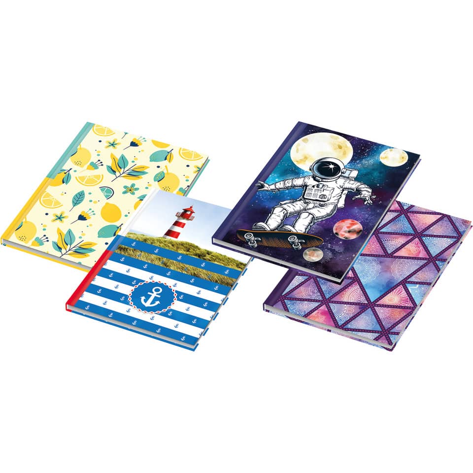 Sortierung Kladden/Notizbücher, „Feelings“, DIN A5, 1 Packung à 4 Stk.. Ausführung Papier: Naturpapier, 70 g/m². Ausstattung: keine, Hardcover. 4 Kladden/Notizbücher mit unterschiedlichen Motiven: „Indian Mandala“ Art.Nr. 46790, „Fresh Lemons“ Art.Nr. 46791, „Maritim“ Art.Nr. 46792, „Skatonaut“ Art.Nr. 46793. DIN A5.. Papierformat: DIN A5. Lineatur/Lineatur-Nr.: sortiert, sortiert. Anzahl der Blätter: 96 Blatt. Farbe des Einbandes: bunt.