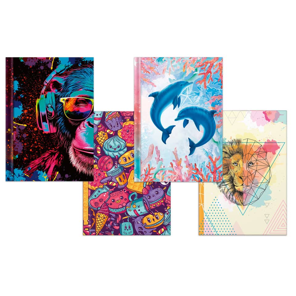 Sortierung Kladden/Notizbücher „Happy Faces“ DIN A4. Ausführung Papier: Naturpapier, 70 g/qm. Ausstattung: keine, Hardcover. Kladden/Notizbücher mit unterschiedlichen Motiven: „Lion“ Art.Nr. 46809, „Sweets“ Art.Nr. 46810, „Neon“ Art.Nr. 46822, „Delfine“ Art.Nr. 46823. Papierformat: DIN A4. Lineatur/Lineatur-Nr.: blanko, 20. Anzahl der Blätter: 96 Blatt. Farbe des Einbandes: bunt.