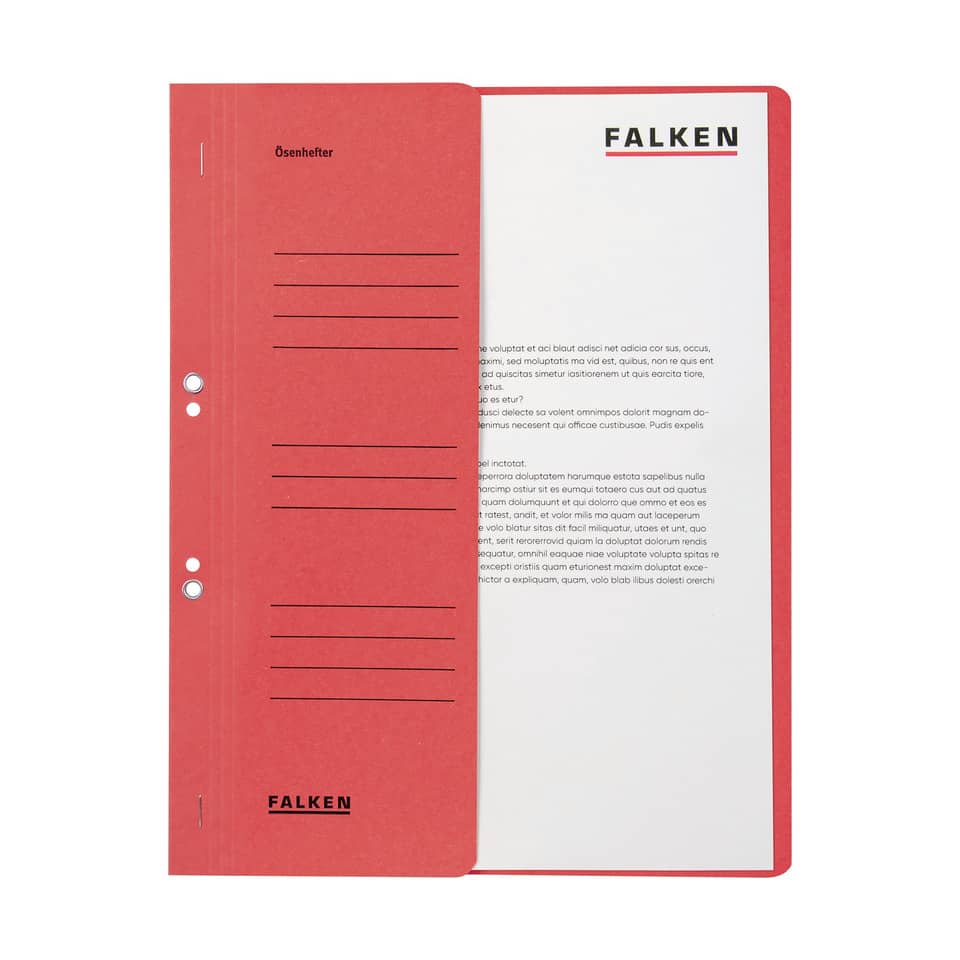 Ösenhefter A4 1/2 Vorderdeckel kfm. Heftung rot. Art der Heftung: kaufmännische Heftung. Ausstattung: halb, Abheftvorrichtung vorhanden, Organisationsaufdruck vorhanden. Werkstoff: Manilakarton. Papiergewicht bzw Stärke: 250 g/qm. Verwendung für Papierformate: A4. Größe (B x H): 240 x 305 mm. Farbe: Rot. Blauer Engel.