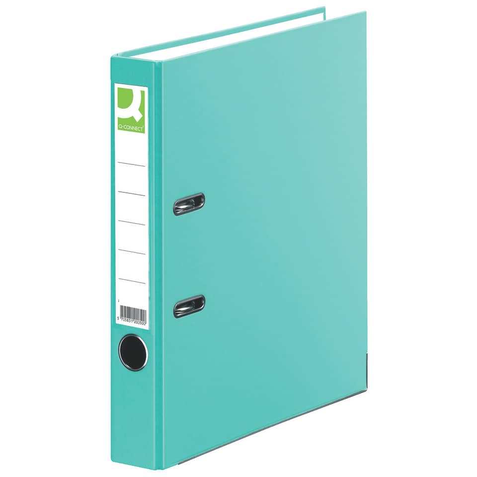 Robuster Kunststoffordner mit Kantenschutz. Kern aus Graupappe mit genarbter Polypropylenfolie überzogen. Innenseiten mit Recyclingpapier kaschiert. Auswechselbares Rückenschild. Ordner mit Hebelmechanik, Schlitzen und Griffloch.
