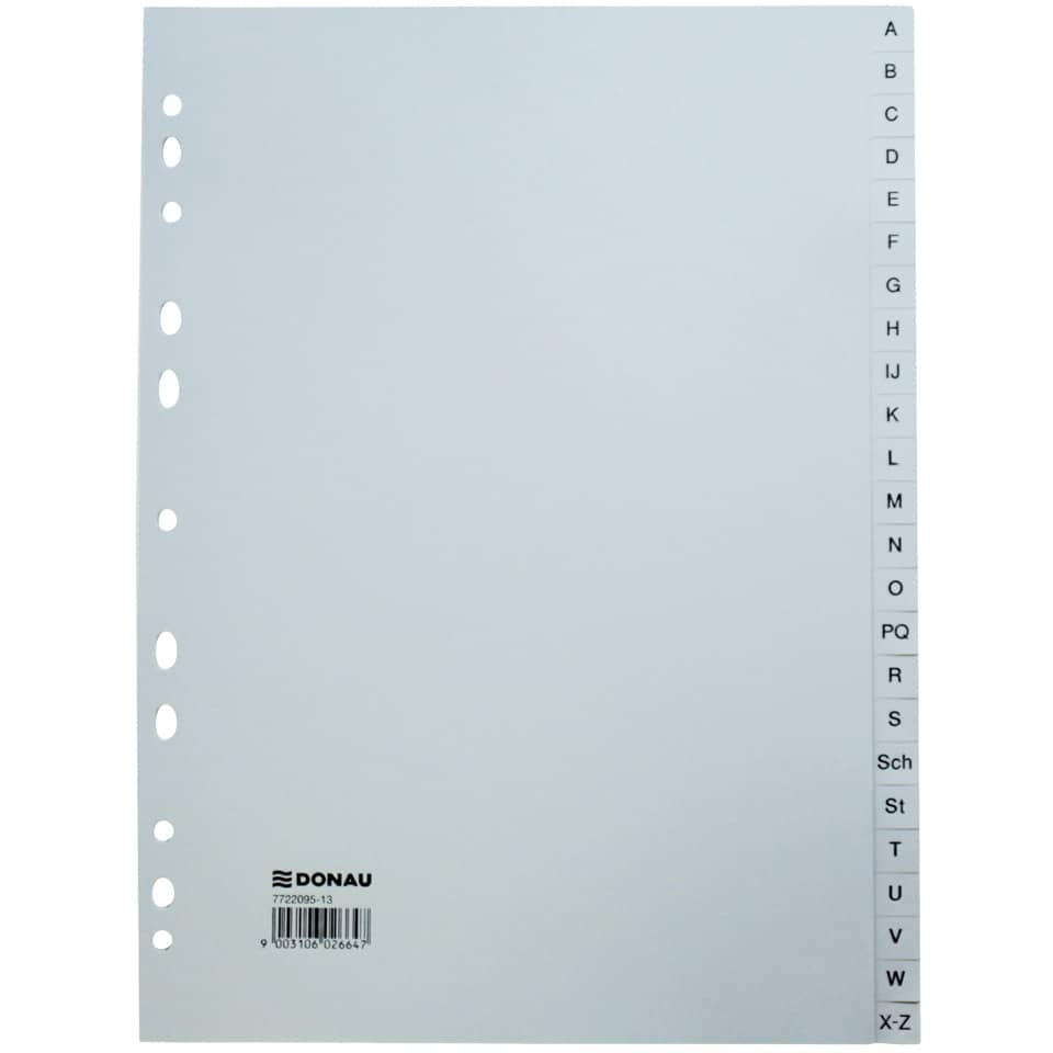 Ordnungsregister aus reißfester PP-Folie mit bedruckten Taben. Registersatz einzeln im Polybeutel verpackt. Alphabetisches Register A-Z, 120 µm, B x H: 225 x 297 mm, 11-fach Lochung, 24-teilig