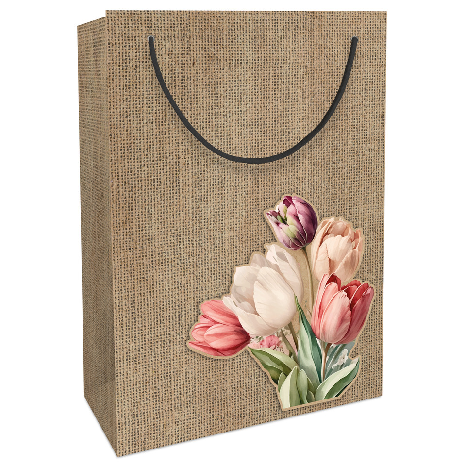 Tasche aus Packpapier im Jute-Look, mit bedruckter, aufgeblockter Applikation