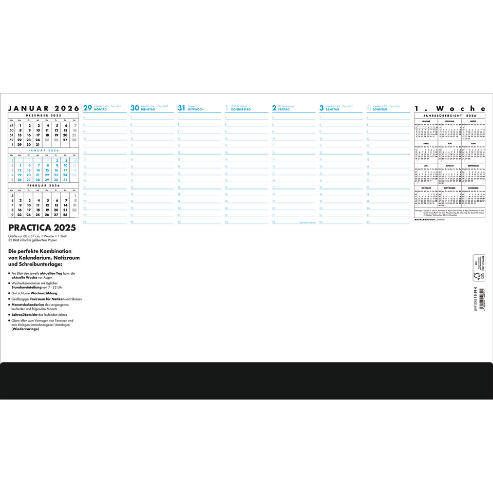 Mit 52 Blatt, aus PEFC-zertifiziertem Papier, auf Kartonunterlage · Material, Oberfläche/Farbe, Stärke: recycelbar · Angabe der Öffnung, besondere Ausstattung und Verwendungsmöglichkeit: 1 Woche/1 Blatt. Mit Dreimonatsübersicht und Jahresübersicht. Viel Raum für Notizen. Blätter oben offen zum Vortragen von Terminen und zum Einlegen von Wiedervorlagen. Leimung an der Unterseite. Auswechselbares Anschriftenverzeichnis unter der Lasche · besondere Ausstattung/Verwendungsmögl. (wasserdicht/wetterfest/UV-Lichtschutz): mit 5 cm breiter, schwarzer Schutzleiste, auf Wunsch mit Werbeprägung. Einzeln in Folie · Material, ggf. Angabe ob dokumentenecht, Oberfläche/Struktur, Stärke: 600 x 370 x 5 mm · besondere Ausstattung/Verwendungsmöglichkeit,ggf. Angabe ob wieder verschließbar: Druck: schwarz/blau · Farbe: weiß.