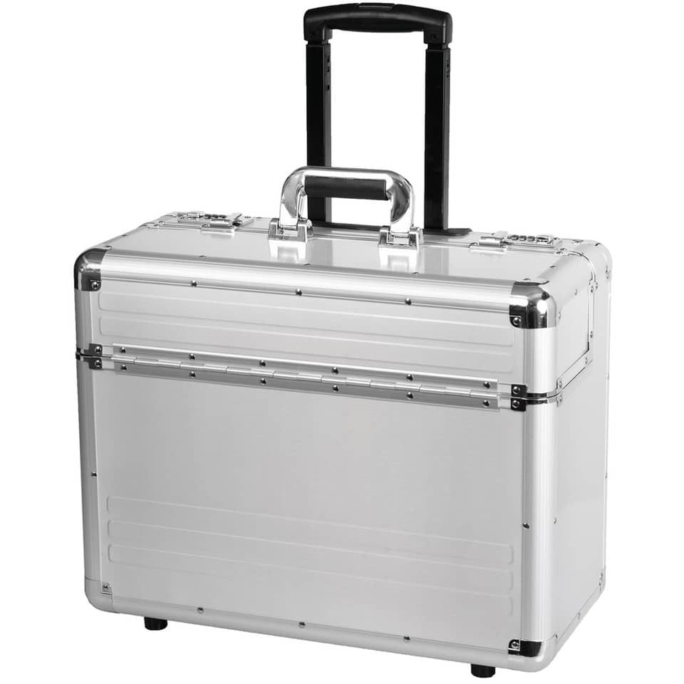 Pilotenkoffer mit großem Innenraum für Ordner und diverse Unterlagen. Deckelklappe mit Stiftehalterung und ein Hauptfach. Mit integriertem, arretierbarem Teleskoptrolleysystem. Trolleyhöhe ca. 102 cm. Mit integriertem Laptopfach. 2 Zahlenkombinationsschlösser, Heavy-Duty-Griff und Skaterrollen auf der breiten Seite. Aus Aluminium. Innenmaße Laptopfach: 440 x 235 x 60 mm. Außenmaße: 480 x 380 x 230 mm.