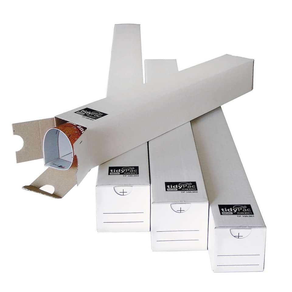 Versandverpackung und Archivbox aus festem Wellkarton für gerollte Güter. Mit Beschriftungsfeld und Kontrollsystem auf der Seitenlasche. Gut stapelbar. Farbe: weiß. Lieferung flachliegend.