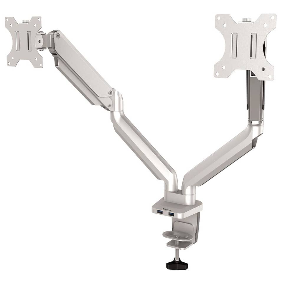 Voll verstellbarer Arm mit Gasfeder-Technologie ermöglicht eine gemeinsame Bildschirmnutzung und kollaboratives Arbeiten. Jeder Arm hält Monitore bis 8kg Gewicht bzw. 81,28cm / 32 Zoll Größe. Voll verstellbarer Arm mit Gasfeder-Technologie bis zu 360° drehbar, 180° schwenkbar und +/-45° neigbar. Mit intuitivem Kabelmanagement. Mit 2 USB Ports an der Basis zum Verbinden verschiedener Geräte. Einfache Befestigung mit Klemme oder durch Kabeldurchführung. Entspricht den ergonomischen Anforderungen für Bürotätigkeiten mit Bildschirmgeräten bestätigt durch FIRA Int. Ltd, einer unabhängigen Ergonomie Akkreditierungsstelle (ISO 9241-5:1998). VESA Standards 75x75mm und 100x100mm.