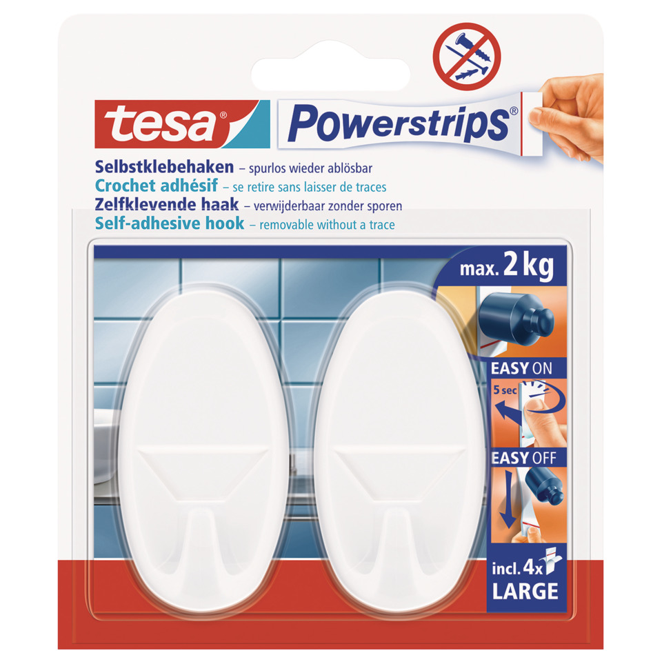 Haken ablösbar tesa Powerstrips® Systemhaken oval weiß. Tragfähigkeit: 2000 g. Jederzeit wieder spurlos ablösbar. Mehrfach verwendbar. UV-beständig. Form: Oval. Größe (L x B): 30 mm. Farbe: weiß. Ausführung des Inhalts der Packung: 2 Haken und 4 Powerstrips Large