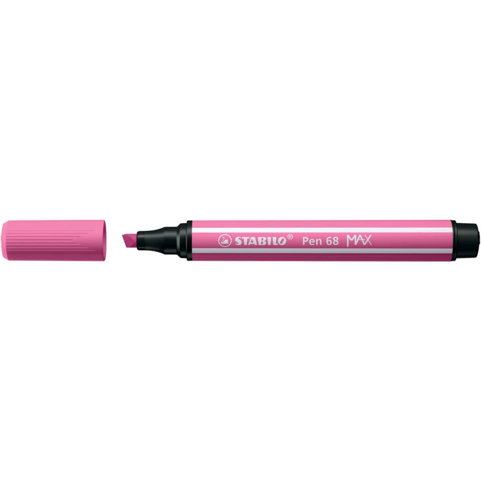 Premium-Filzstift mit dicker Keilspitze STABILO® Pen 68 MAX. ideal zum Ausmalen großer Flächen und zum Zeichnen exakter Konturen. Brillante, satte Farben, perfekt abgestimmt auf die Farb-Palette von Pen 68 und point 88. Bis zu 12 Stunden Austrocknungsschutz ohne Kappe. Ventilierte Kappe – am Stiftende aufsteckbar. Ausführung Schreibflüssigkeit: Tinte auf Wasserbasis ideal auch für Aquarell-Effekte, Schreibfarbe von Schreibgeräten: erika, geruchsneutral. Ausführung Schreibspitze: Ausführung der Spitze: Faserspitze (Keil), Strichstärke: 1 + 5 mm. Ausführung Schaft: Farbe des Schaftes: Schreibfarbe mit weißen Kantenstreifen. Material des Schaftes: Kunststoff.