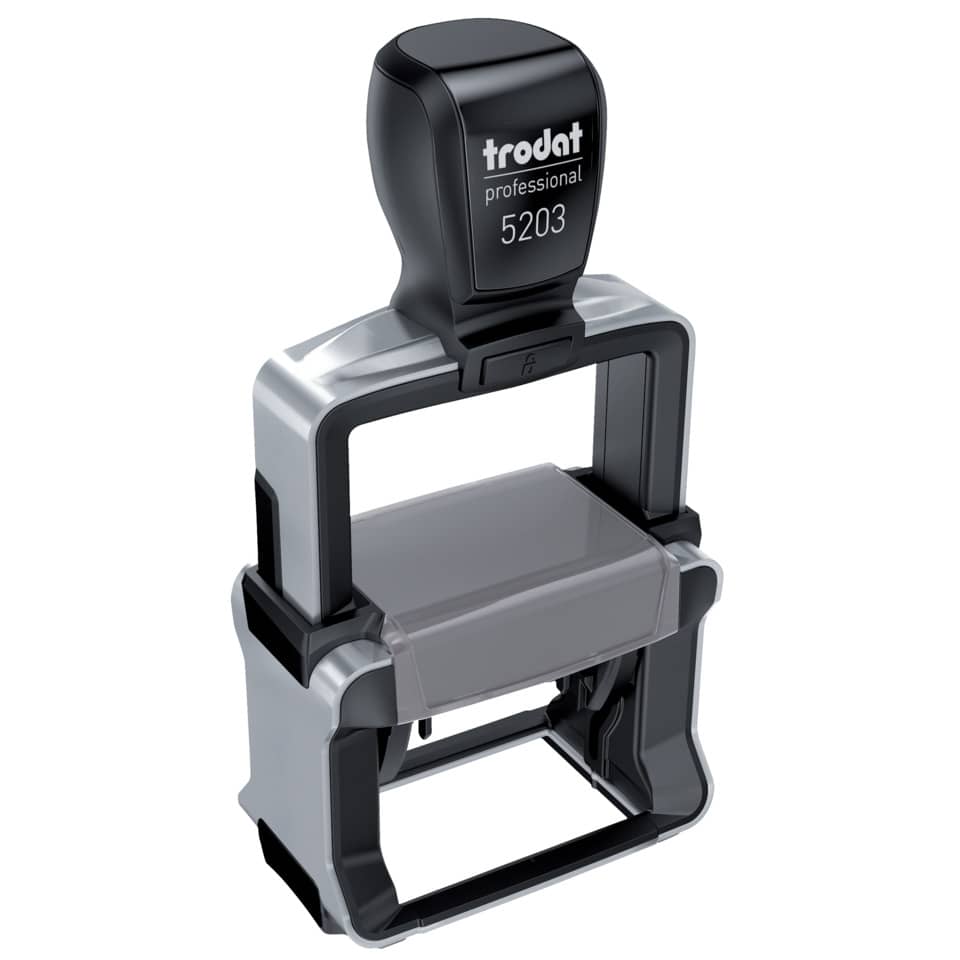 Trodat Professional 5203 mit Gutschein für individuelle Textplatte. Anwenderkomfort und Sauberkeit garantiert. Robuster Textstempel mit Stahlkern für den täglichen Einsatz im Büro, integriertes Stempelkissen, ergonomischer Griff, einfaches Platzieren des Abdrucks. Der Stempel wird mit einem Gutschein für ihre individuelle Gestaltung des Abdruckes geliefert. Ökologisch nachhaltig in Österreich produziert.